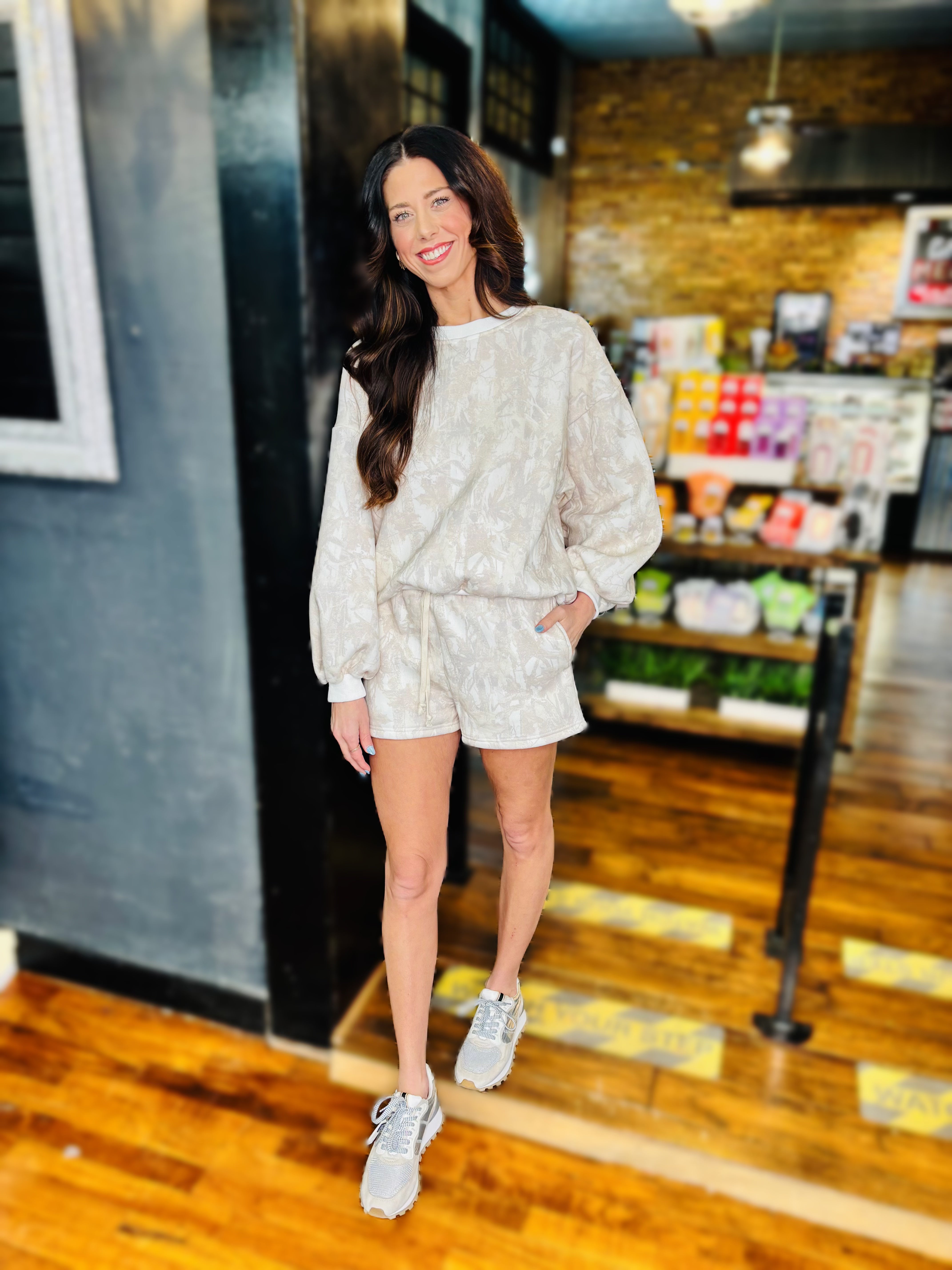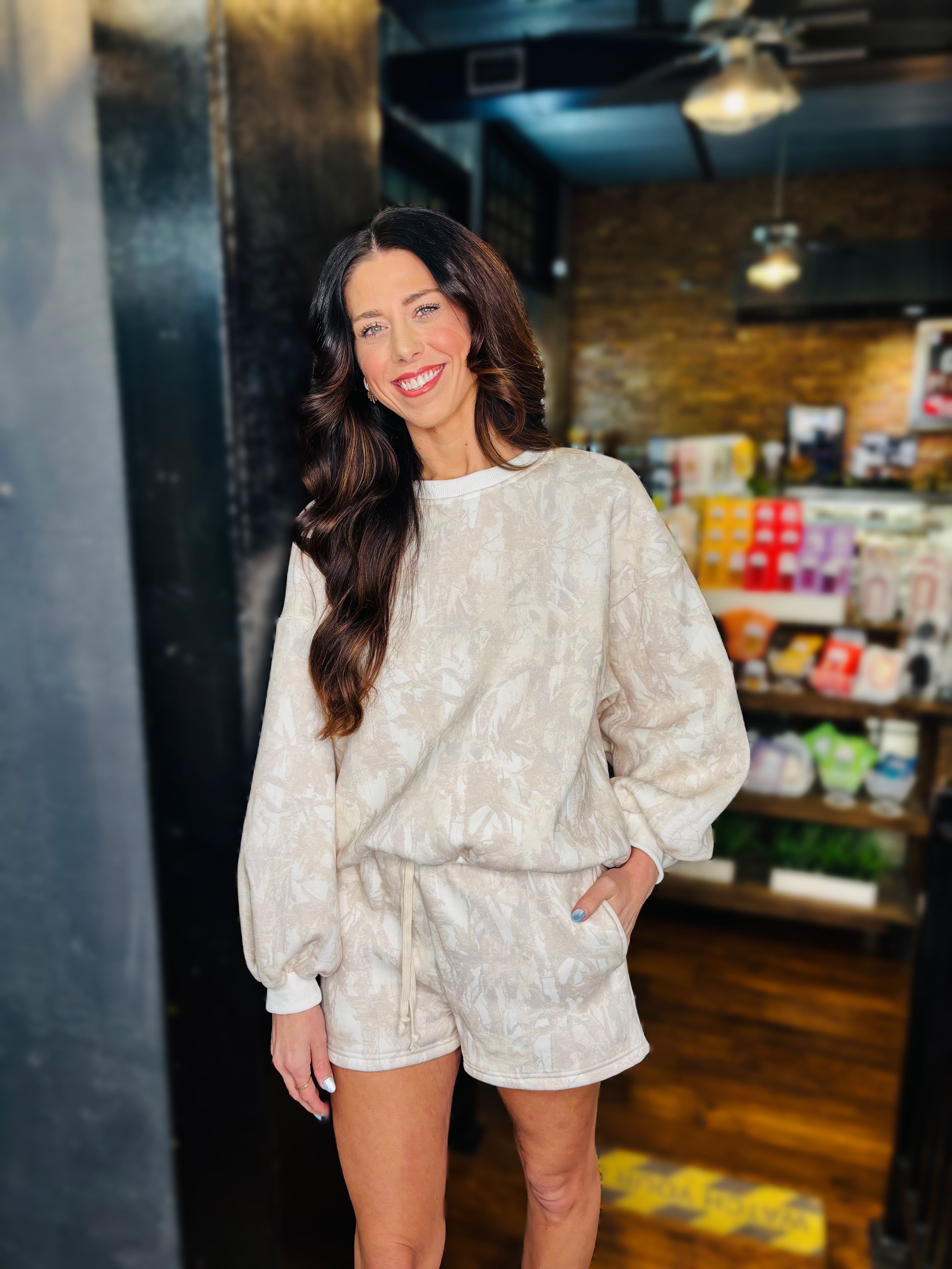 Stay comfortable and confident in this Camo Crewneck Set. Featuring a cozy camo sweatshirt paired with matching shorts, this set offers easy, all-day wear perfect for relaxing or casual outings. The natural tones and classic camo design bring a stylish, laid-back vibe to your wardrobe. Ideal for those who value both comfort and effortless style.
