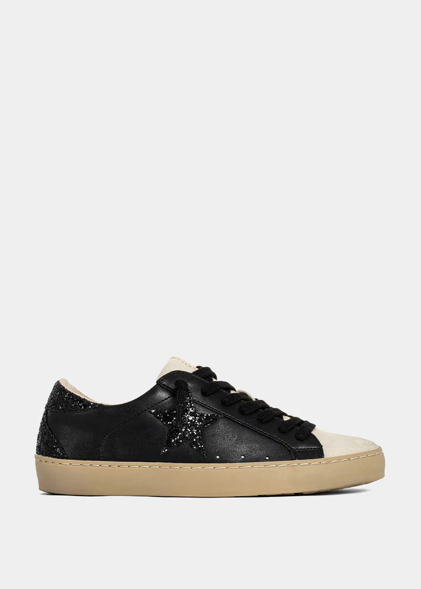 Edgy meets elevated. The PAULA in Charcoal is your go-to for a sleek, city-inspired look. Its deep slate grey upper, black glitter heel tab, and tonal star bring drama without losing its easy-going attitude. Whether you're pairing it with an all-black outfit or playing with contrast, this sneaker makes every step cooler.